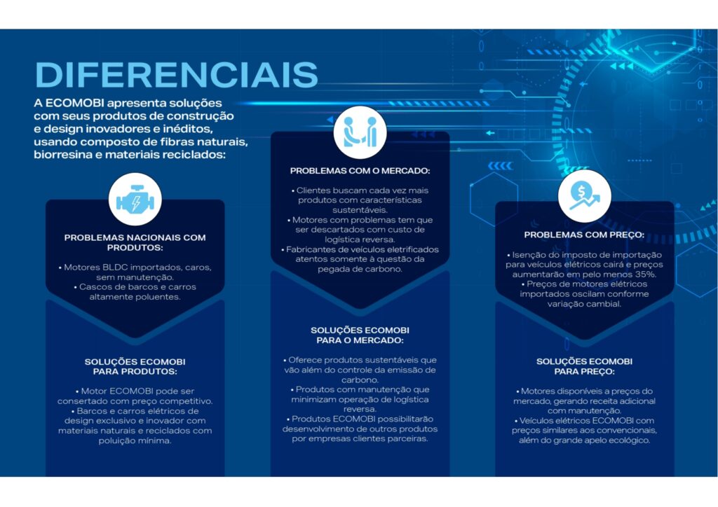 A Ecomobi Brasil é uma empresa de soluções em eletromobilidade sustentável, focada em unir as mais avançadas tecnologias mundiais com as necessidades dos brasileiros, para criar produtos inéditos e inovadores em motores elétricos, módulos eletrônicos, fibras naturais e biorresina, reaproveitamento de baterias, veículos terrestres e embarcações, sempre buscando preços competitivos e o menor impacto ambiental.